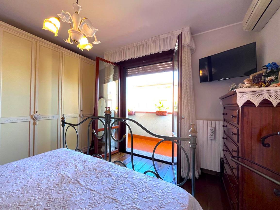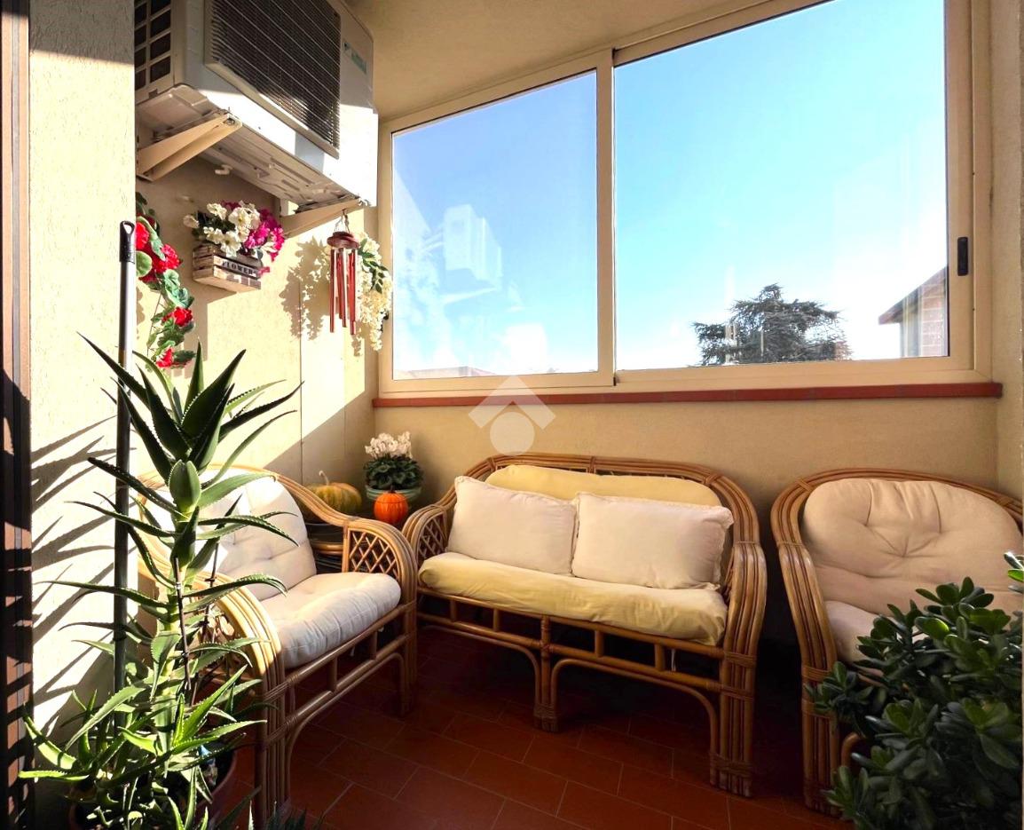 L'appartamento si apre su un luminoso soggiorno con cucina a vista, ideale per momenti di convivialità. La zona notte comprende due camere da letto, perfette per una famiglia o per chi desidera uno spazio aggiuntivo per ospiti o studio. Il bagno è finestrato, garantendo luce naturale e ventilazione. Completano la proprietà due terrazzi, che offrono spazi esterni privati per il relax.