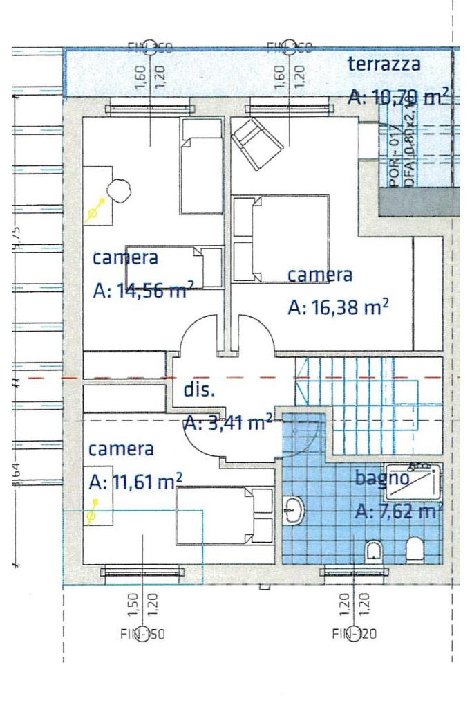 L'immobile disposto su due livelli, al piano terra ingresso su soggiorno con angolo cottura, di dimensioni generose (37,25 mq) con accesso diretto alla loggia e bagno finestrato. Con una comoda scala in muratura si accede al piano seconodo, due camere matrimoniali, una camera doppia, un bagno finestrato ed un terrazzo di (10,68 mq).